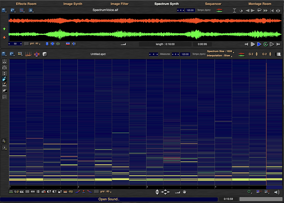 The Image Synth allows users to draw lines, curves, shapes, brush strokes, spray textures, shade harmonics, etc., within an XY time and frequency empty or grided canvas. The canvas can be set to any frequency scale with adjustable sizes and time values. The canvas is stereo with red left track and green right track. Images that are yellow are mono center. Each track can be drawn separately and then played together for a completed stereo image. The image can be stored as a preset and recalled at any time. There are a wide selection of image adjustments that allow for image rotation, duplication, division, stretching, remapping and moving the image anywhere on the visible canvas. Images can be drawn freely or within grid values for precise rhythmic timings. The sound generated by using the drawing tools in the tool pallet is produced by a factory preset or customized MetaSynth instrument. The MetaSynth instrument is chosen or created by selecting one of the 4 different synthesis engines: Wave Synth, Multiwave Synth, Grain Synth and Sampler. The instrument is triggered by the lines, shapes and patterns drawn on the canvas determined by pixel length, width, density, height and color. Up to 7 individual stereo layers of drawn information is possible within the image synth. The completed drawing, along with the MetaSynth instrument, can be rendered to the MetaSynth project folder or saved to disc at a specified, sample rates, bit depth, and file format.